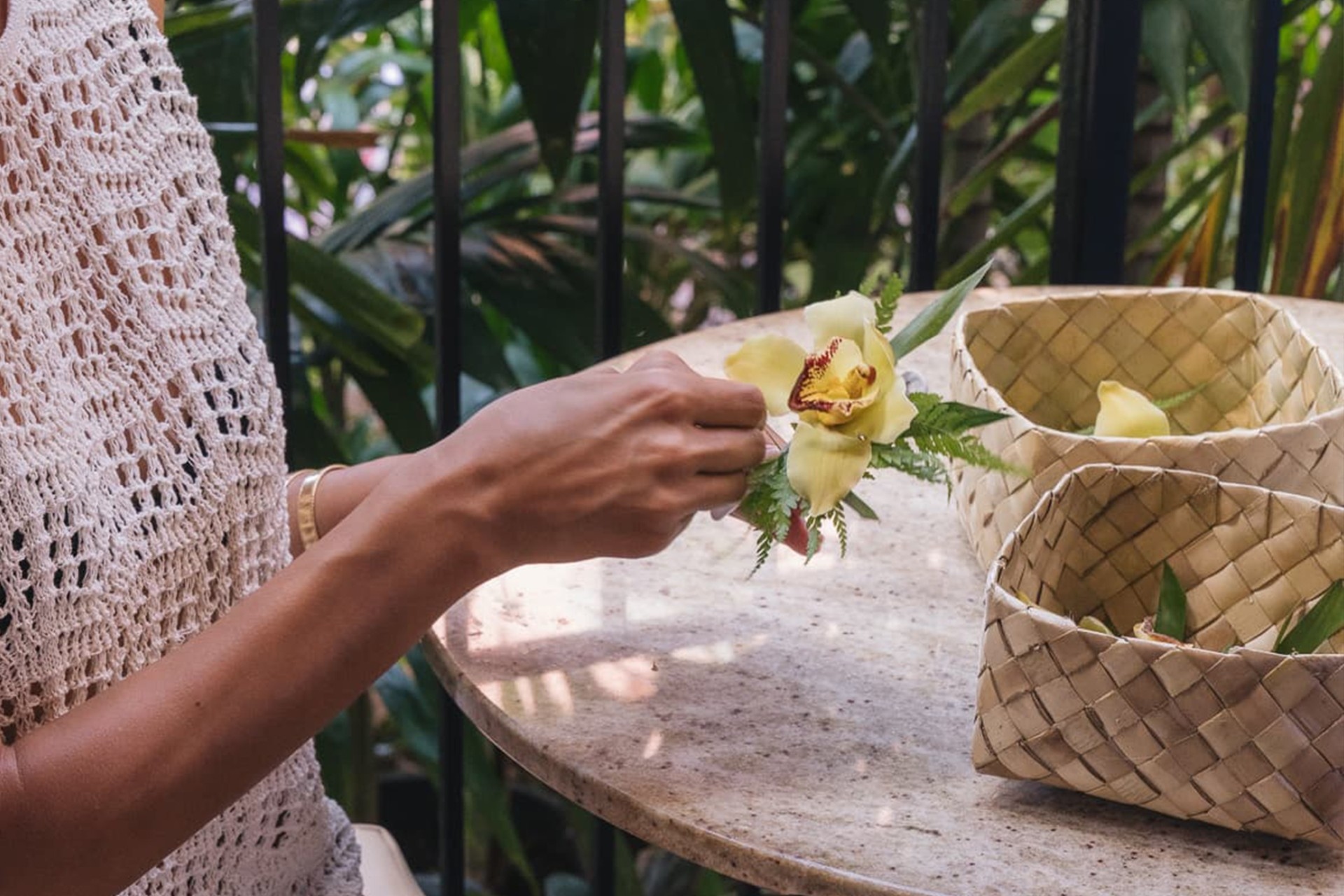 「フローラルヘアピース作りワークショップ」では、ランやハワイのシダ、季節の花々を使って、色鮮やかなヘアアクセサリーを手作りできます。